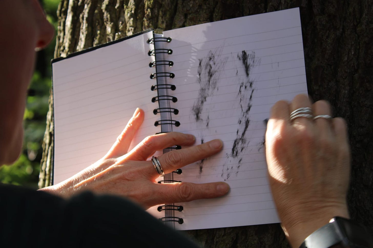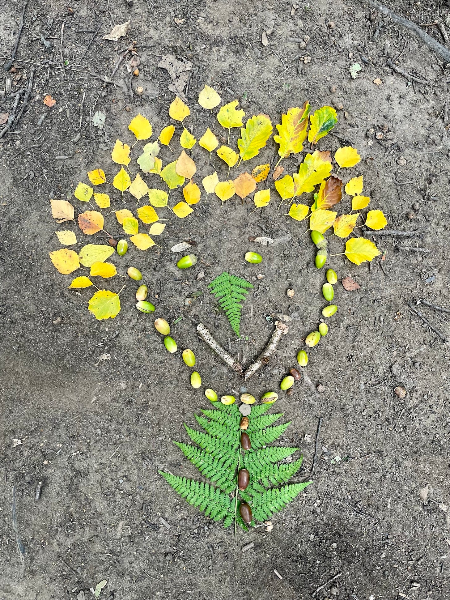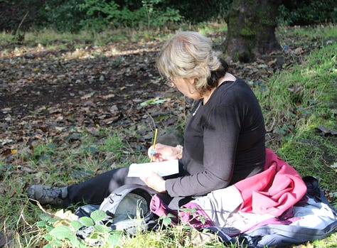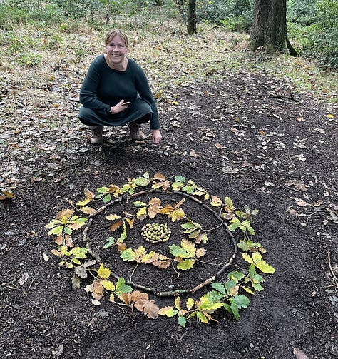 Everyone did different things, we had people create art of the woodland floor using leaves and acorns, taking intuitive photos, sitting on the floor, and sketching the trees, being inspired by the trees for fairy stories, finding characters in trees and little treasures, and one person pausing to sit on a log to identify the bird calls around her.