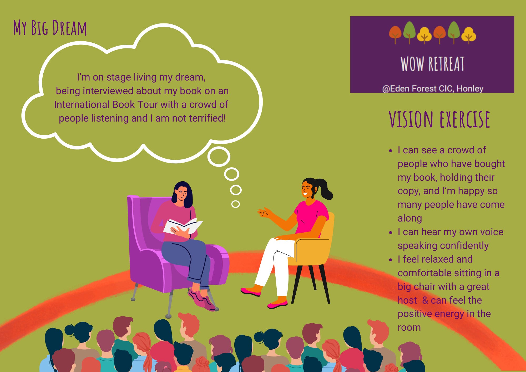 Anyway, back to the retreat, and what followed next, after the pizza creation and devouring of, was an exercise in creative thinking. Sitting round the campfire, we did a visioning exercise where our participants were encouraged to dream big and write or draw a situation as if it has happened or is happening. As an example of this I handed out the visual below.